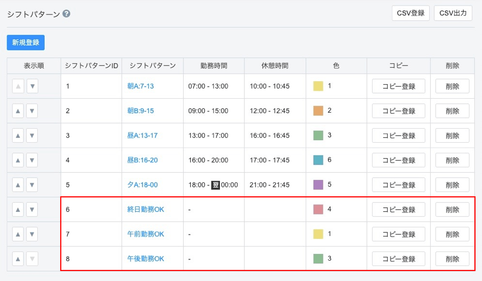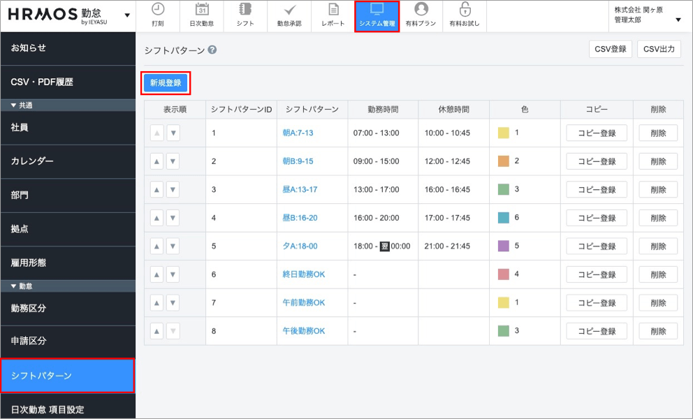 [システム管理>シフトパターン]画面の「新規登録」ボタンより新しいシフトパターンを作成します。