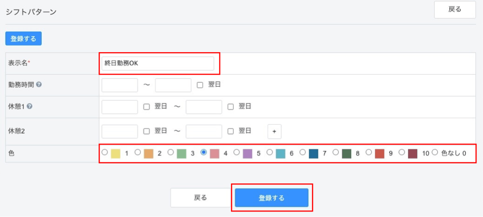 シフトパターンの表示名や色などを登録してください。