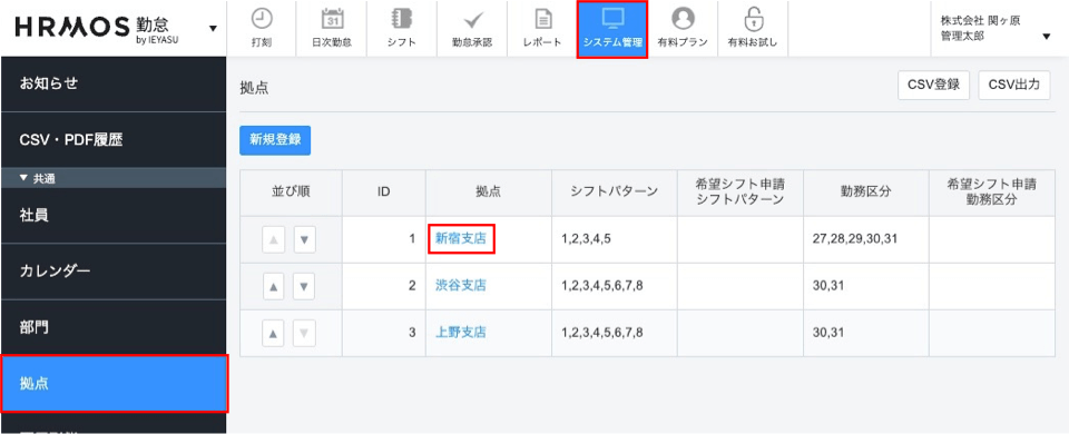 [システム管理>拠点]画面で、編集したい拠点名を選択します。