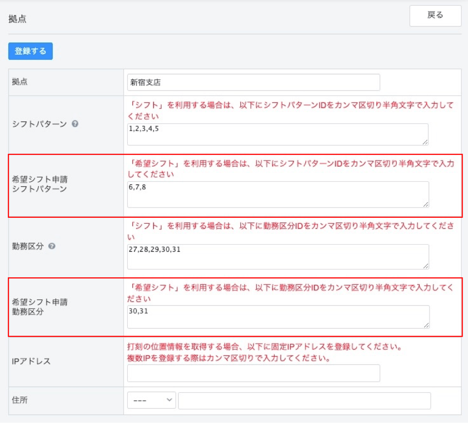 「希望シフト申請シフトパターン」の項目に申請させるシフトパターンのシフトパターンIDを、「希望シフト申請勤務区分」の項目に申請させる勤務区分の勤務区分IDを、半角英数字でご入力ください。ご入力後、「登録する」ボタンをクリックします。