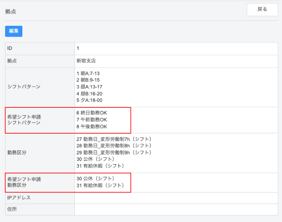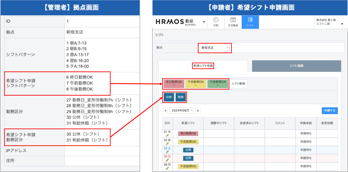 拠点確認画面で「希望シフト申請シフトパターン」「希望シフト申請勤務区分」に正しく登録されていることをご確認ください。