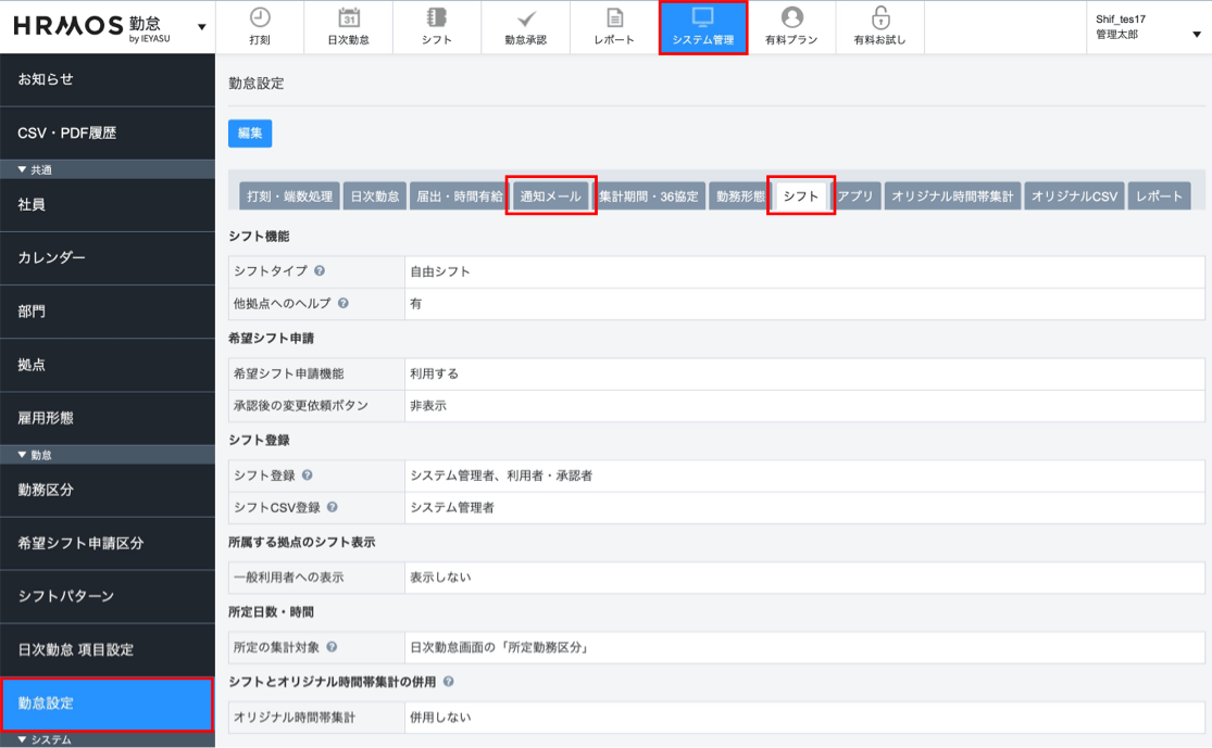 [システム管理>勤怠設定]画面の「シフトタブ」「通知メールタブ」より、希望シフト申請に関する設定を行います。