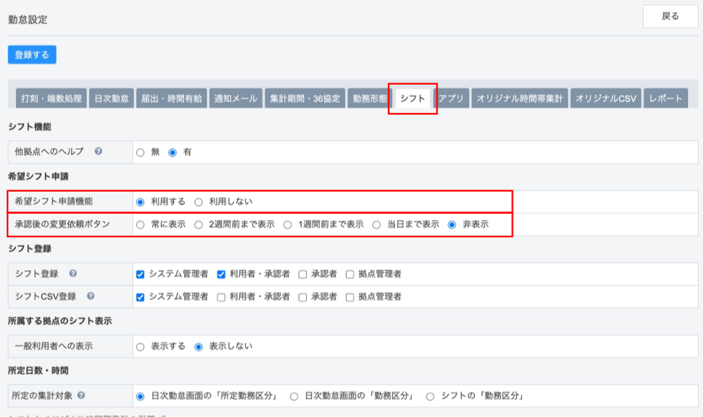 [システム管理>勤怠設定>シフトタブ]画面から「承認後の変更依頼」の設定を行います。
