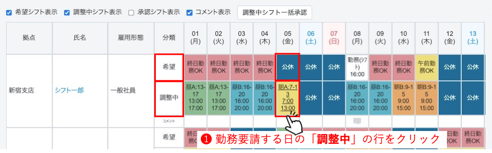 まず、勤務要請をする日の「調整中」の行をクリックします。