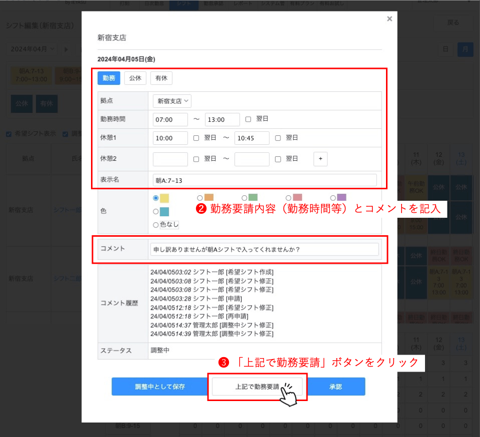 勤務要請内容(勤務時間など)とコメントを入力し、「上記で勤務要請」ボタンをクリックします。