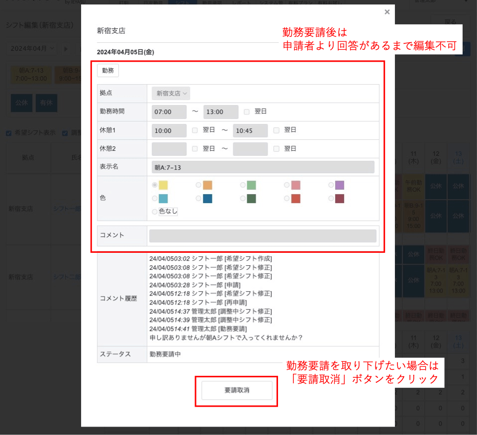 「ステータス:勤務要請中」は、申請者より勤務要請の回答(承諾・却下)があるまで編集できません。