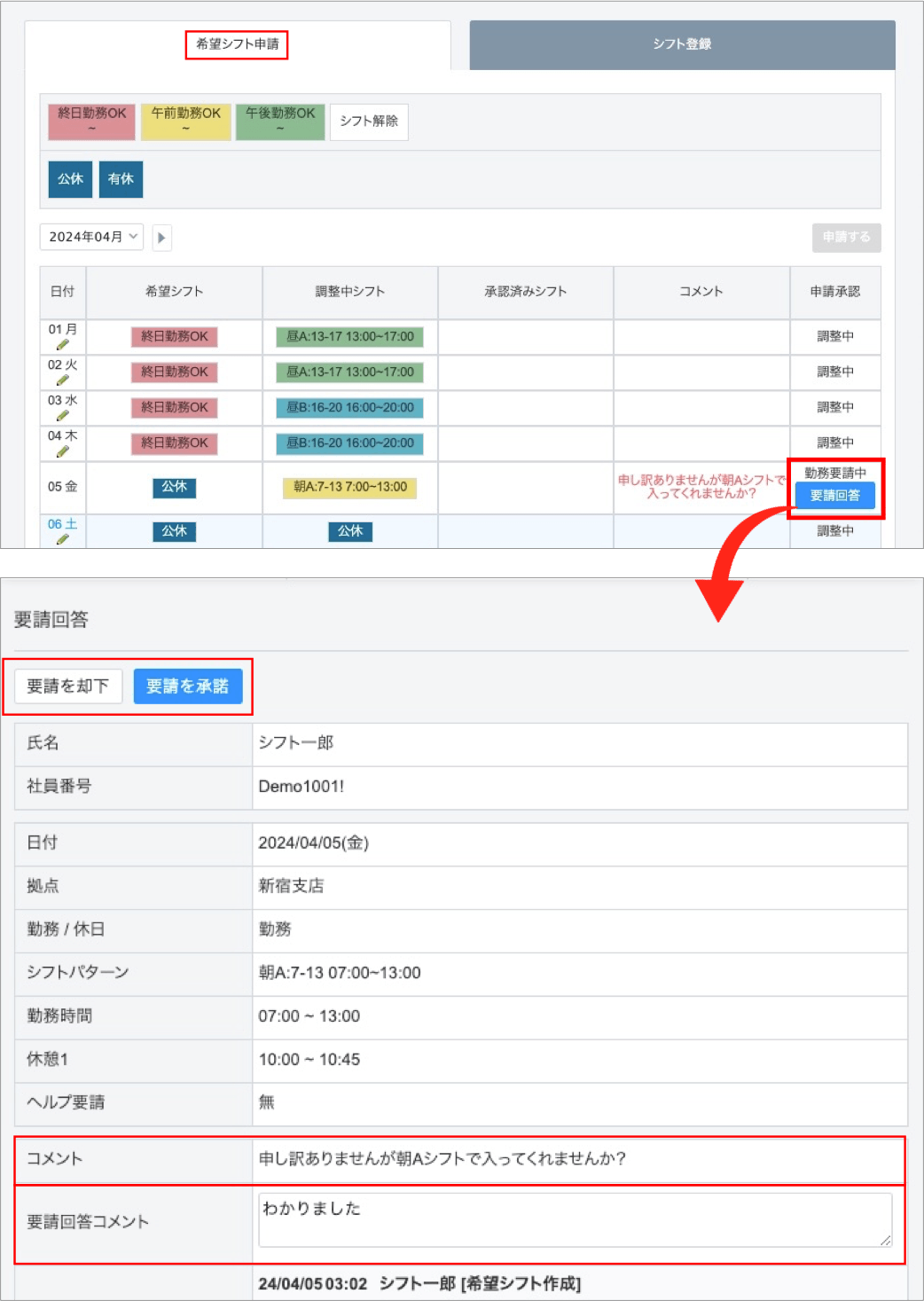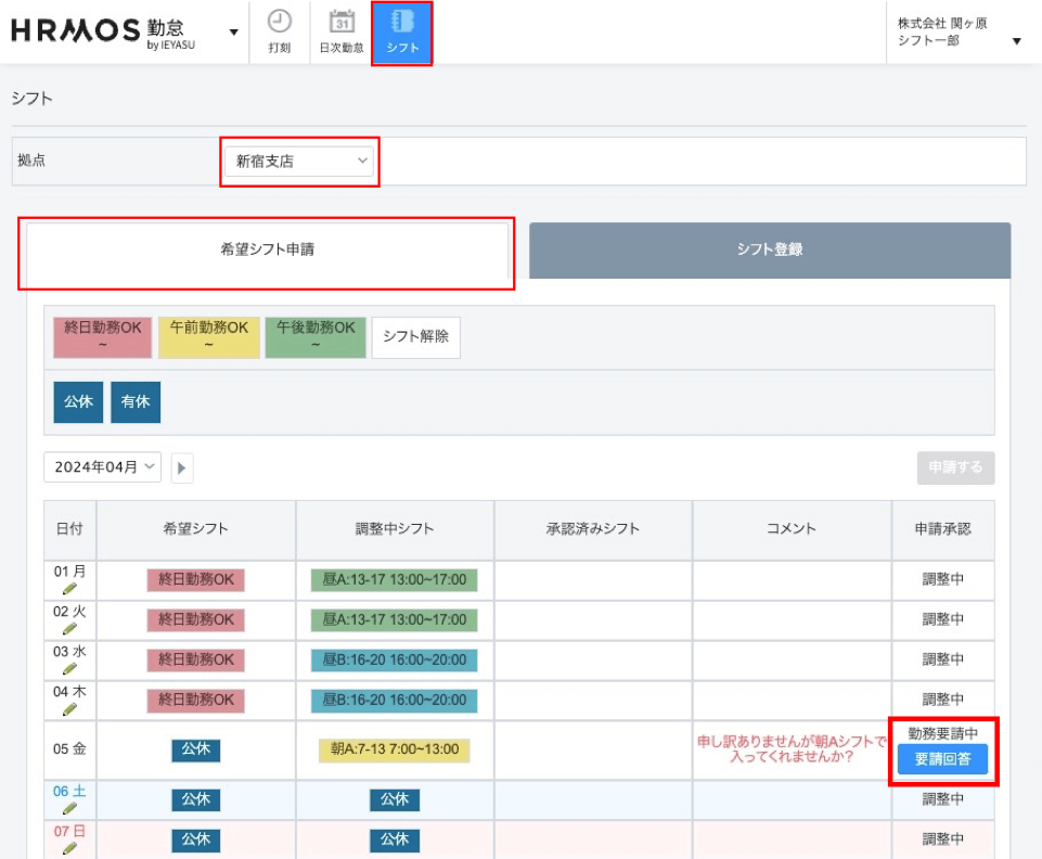 【申請者:勤務要請の回答】