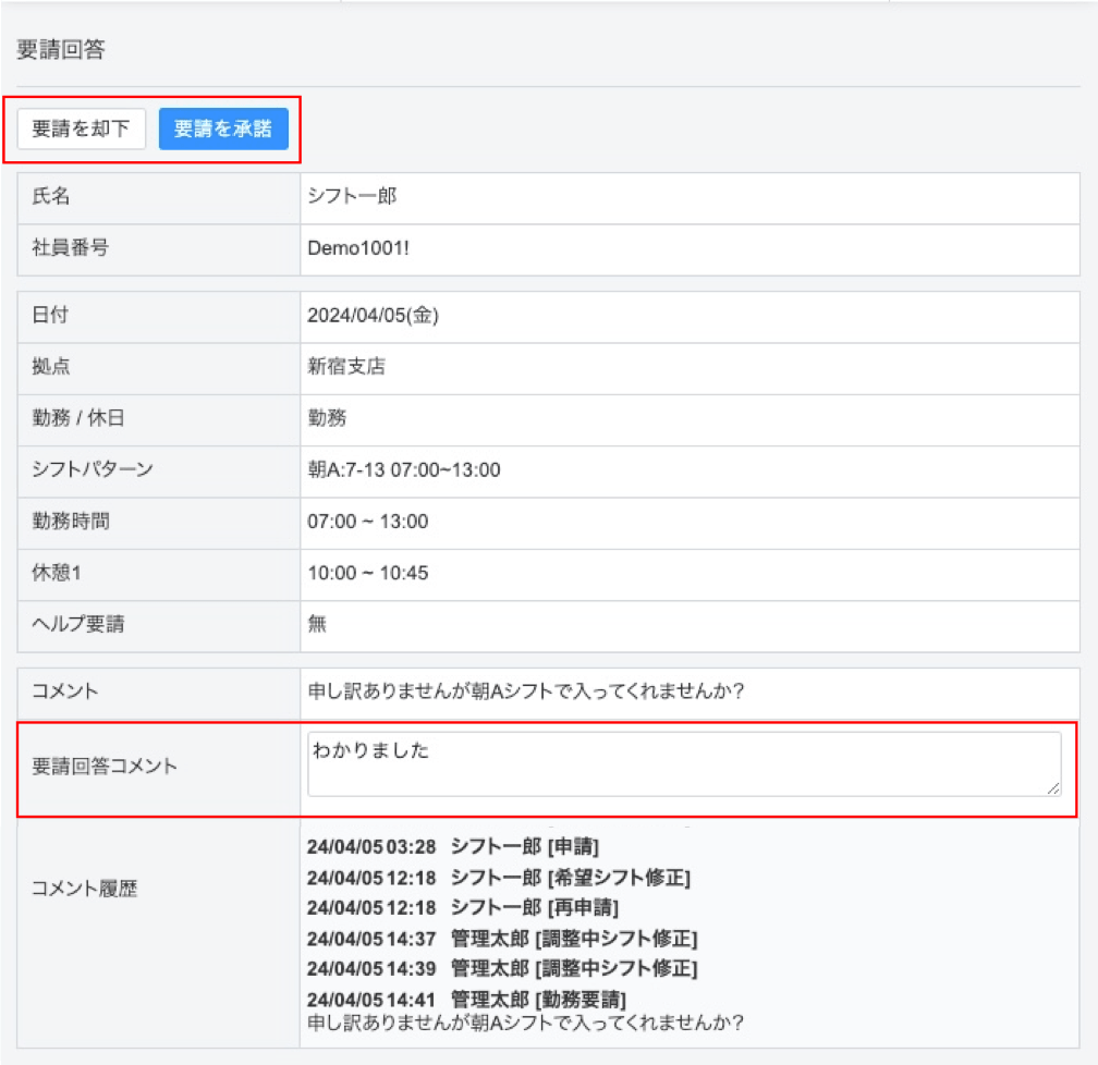 勤務要請の内容を確認し、要請回答コメントを残した上で、「要請を承諾」「要請を却下」のいずれかのボタンをクリックしてください。