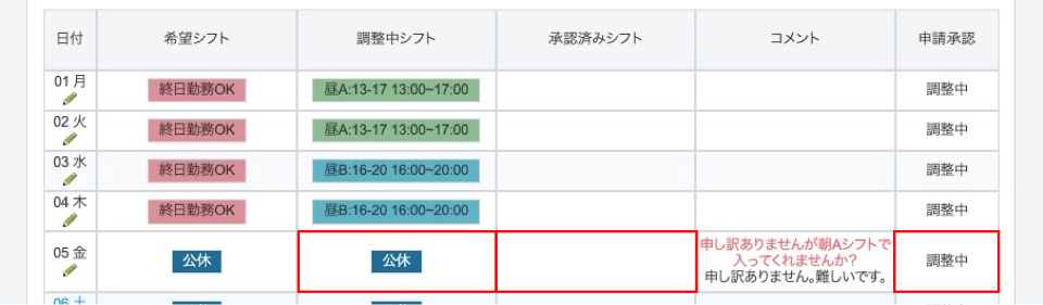 勤務要請が却下されれば、ステータスは「調整中」に戻り、「調整中シフト」の列は勤務要請前のシフトに戻ります。