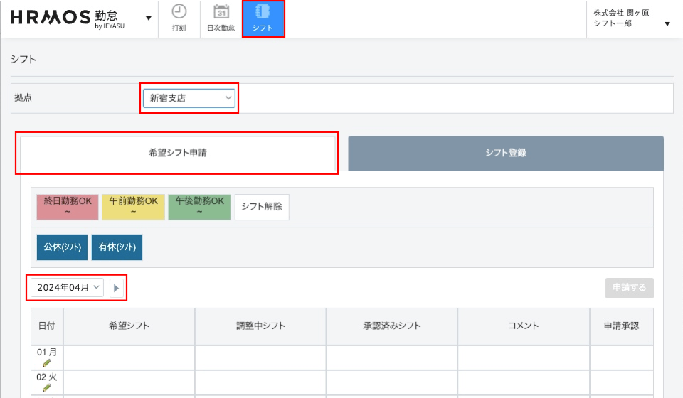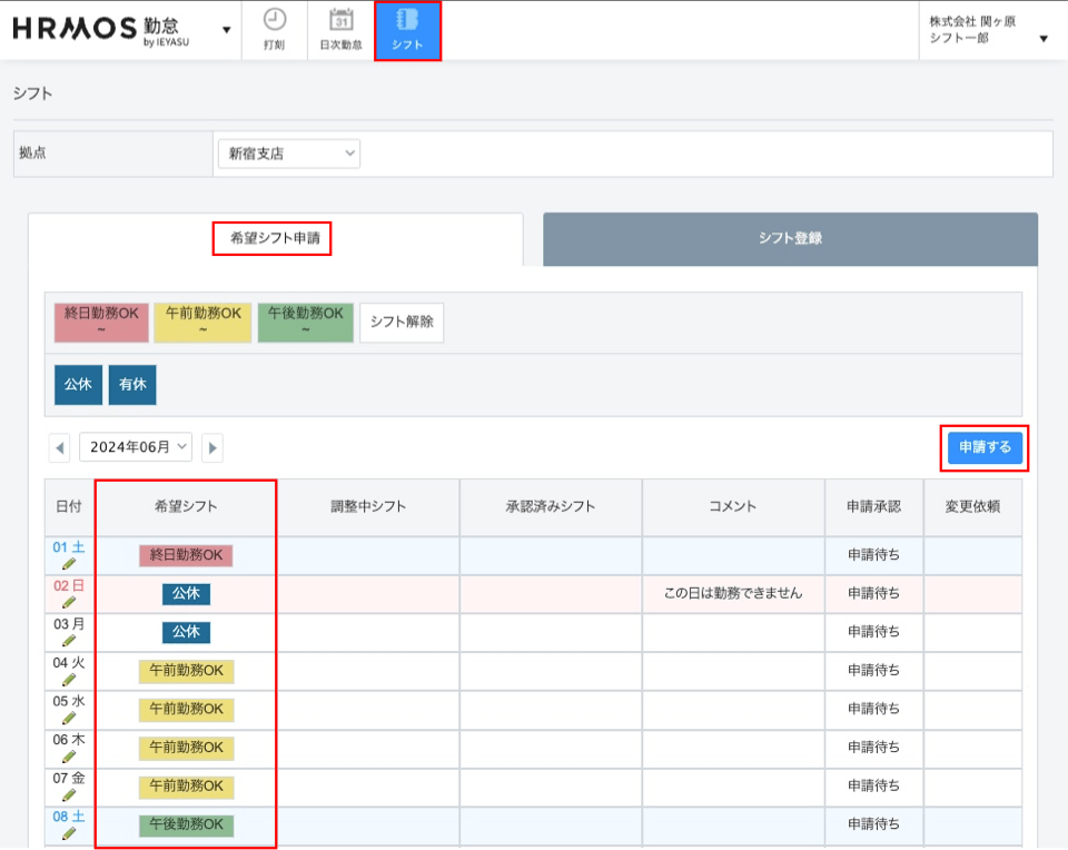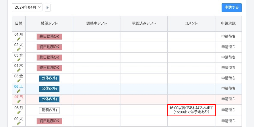 【申請者:希望シフト申請画面】
