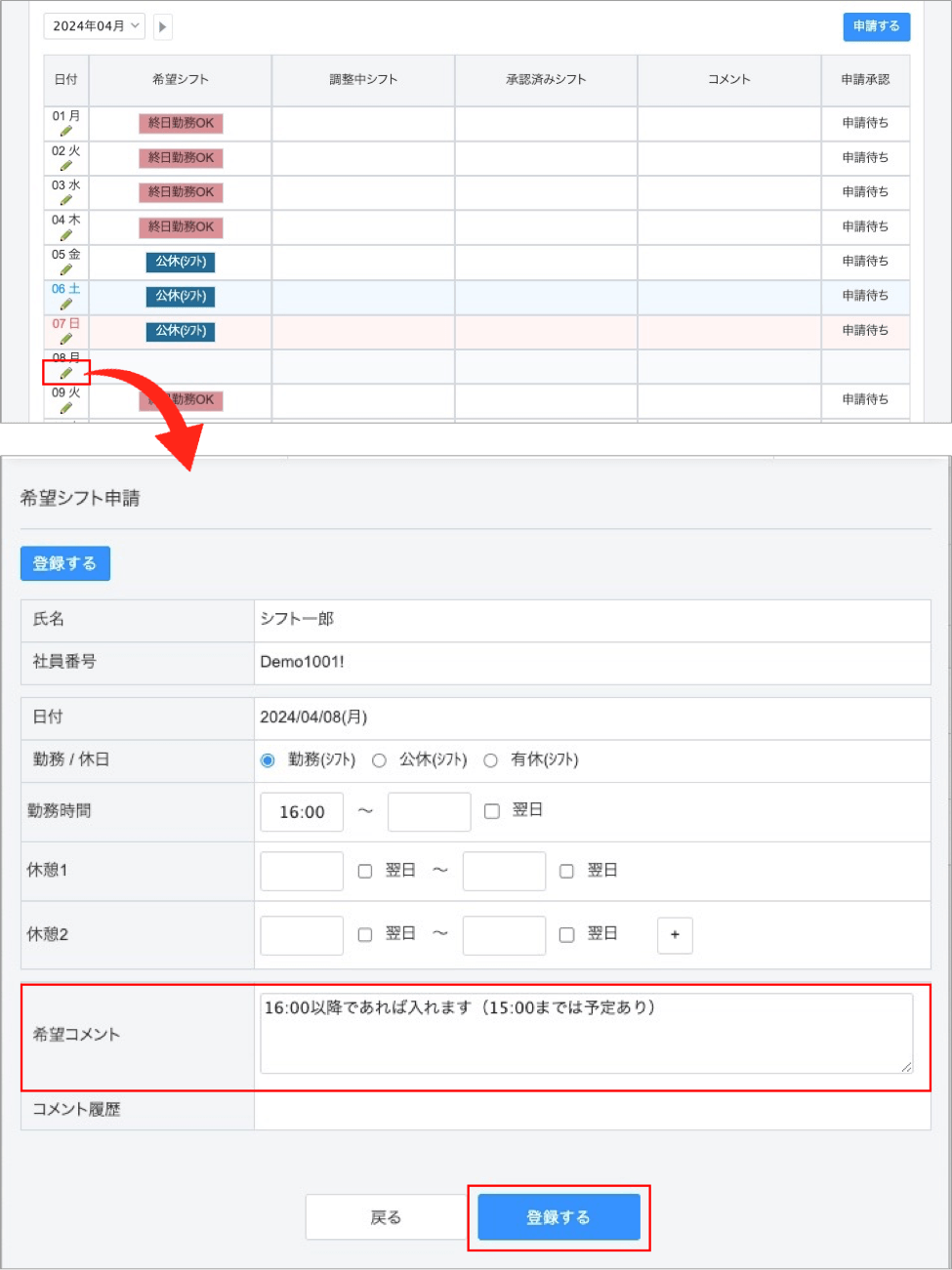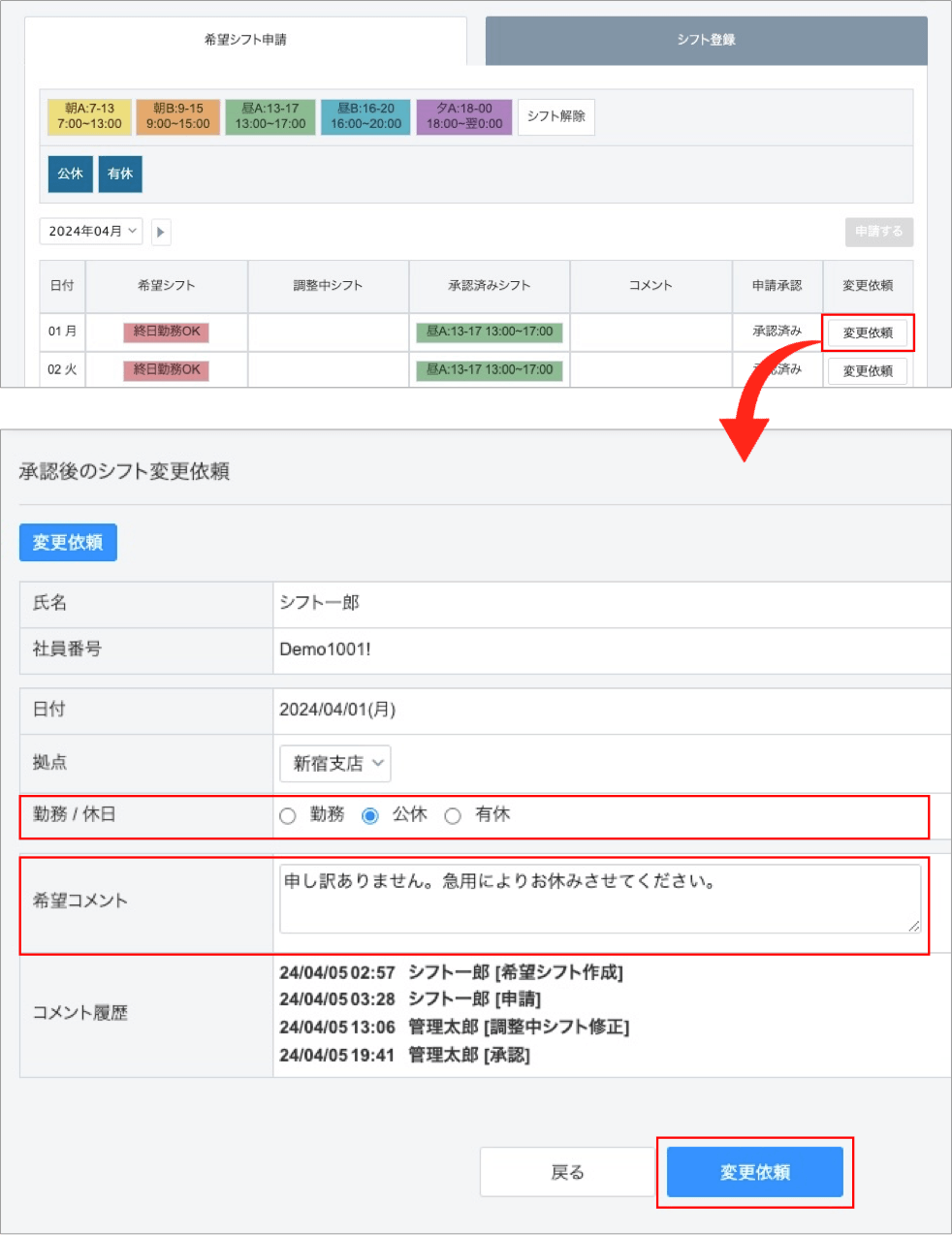 承認後のシフト変更依頼画面から、変更したいシフトの内容を記入し「希望コメント」を添えた上で「変更依頼」ボタンをクリックします。