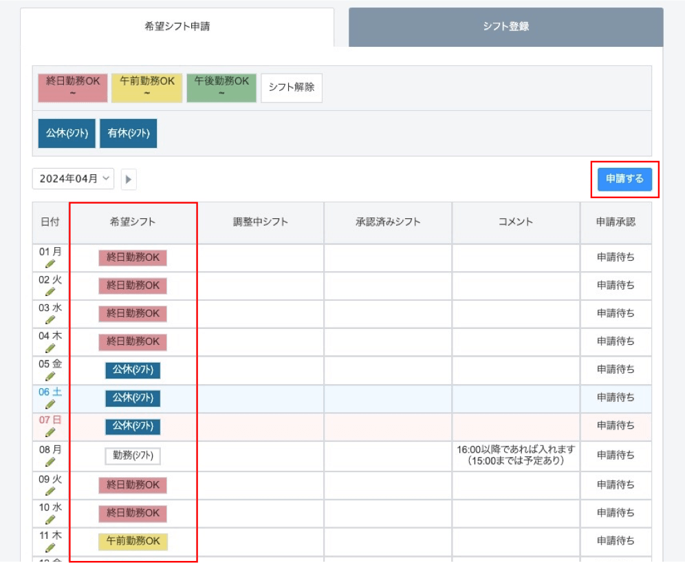 - 予め管理者が登録しておいたシフトを確認し、勤務が難しい日があれば「公休」を申請させる