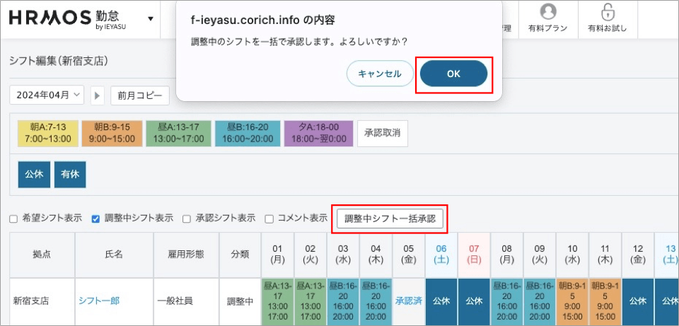 すべてのシフトの調整が完了しましたら、「調整中シフト一括承認」ボタンをクリックします。確認メッセージが表示されますので「OK」をクリックしてください。