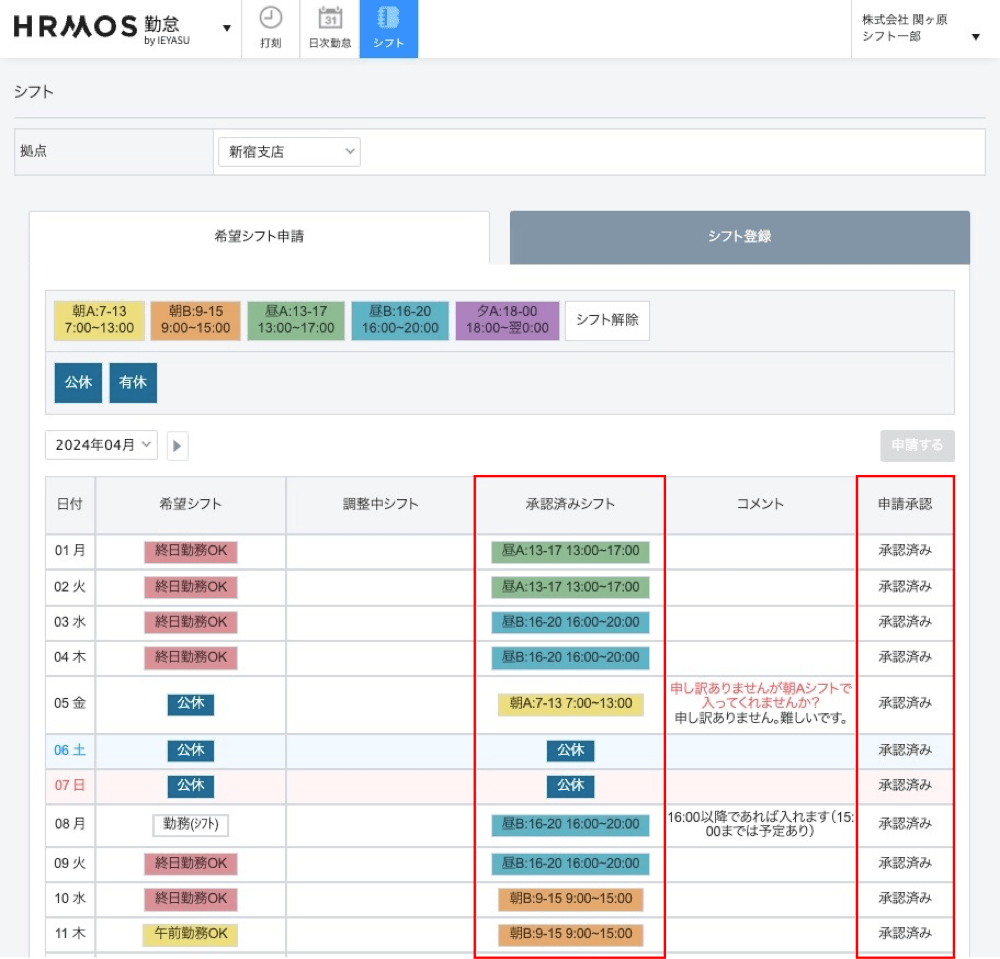 変更依頼が承諾されれば、ステータスは「承認済み」となり、「調整中シフト」の列から消え「承認済みシフト」の列へ変更依頼内容が反映されます。