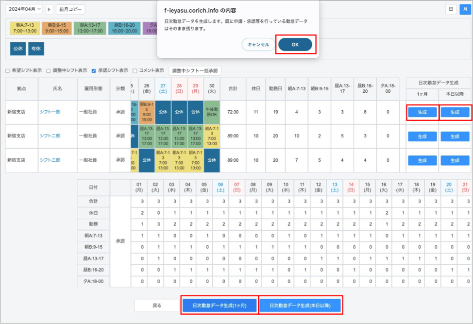 シフト編集画面の最右部、最下部に表示されている「日次勤怠データ生成」ボタンをクリックします。