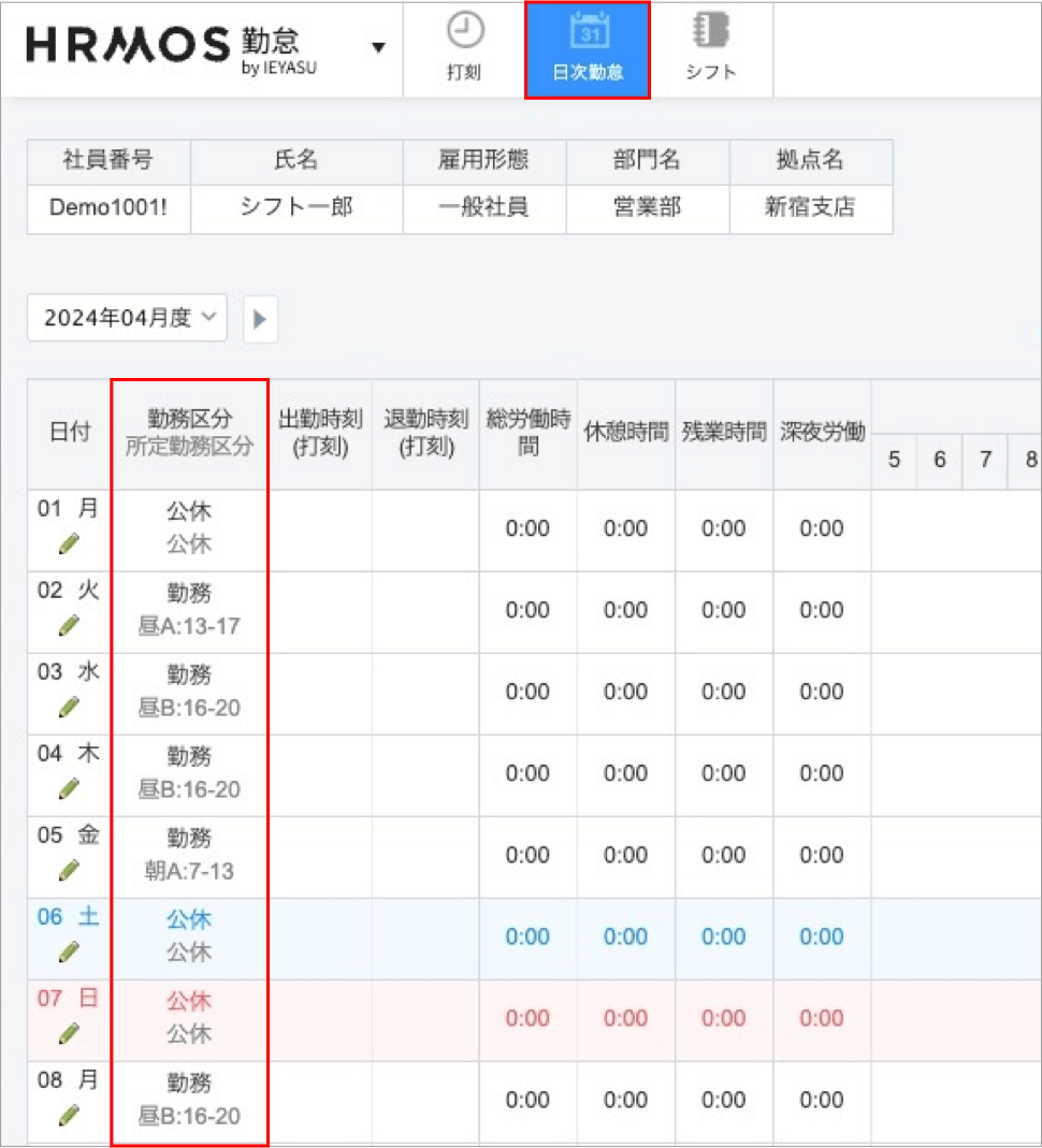 「生成」ボタンをクリックしたことで、申請者の日次勤怠画面(勤務表)へ新しいシフトが反映されます。