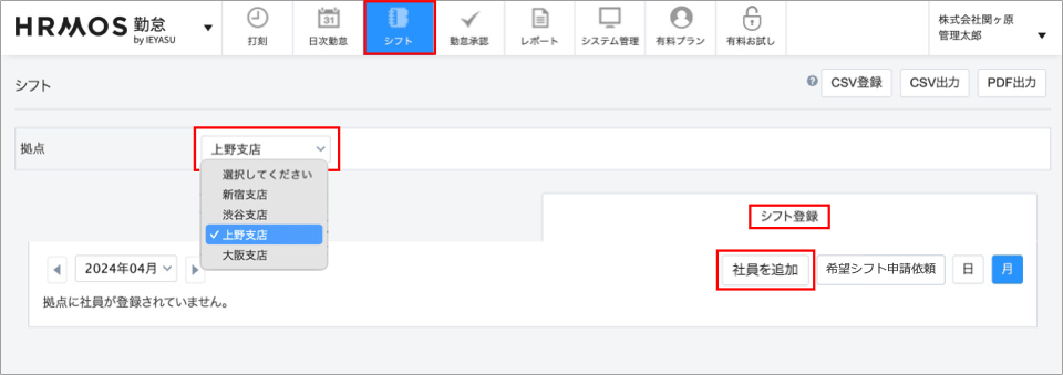 上部メニュー「シフト」をクリックし、シフトを登録する拠点を選択します。