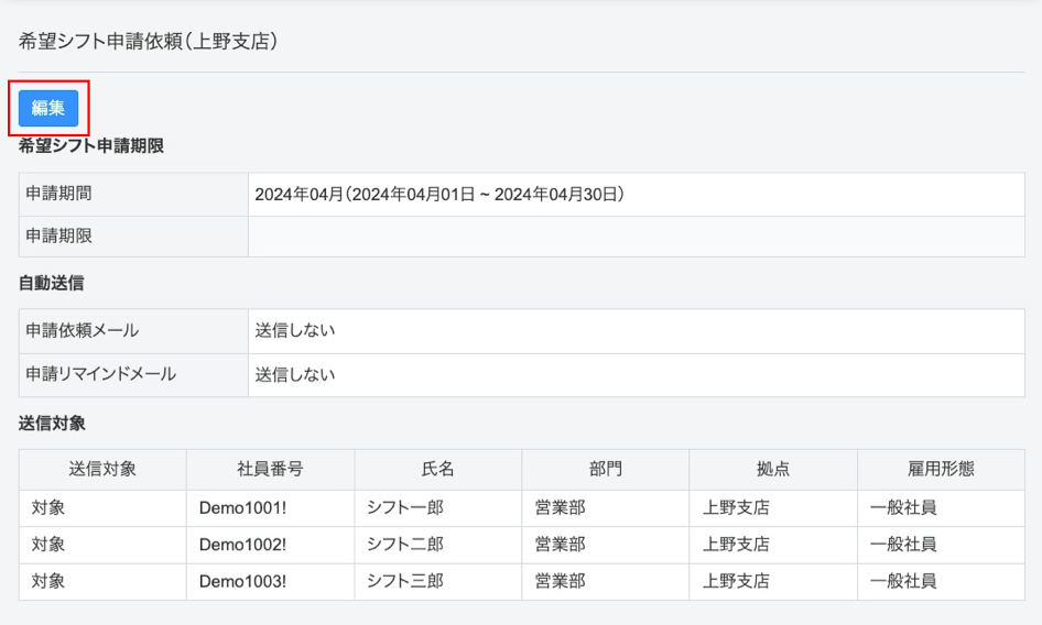 [システム管理>社員]画面で、シフトを利用している従業員の編集画面を開き希望シフト申請の設定を行います。