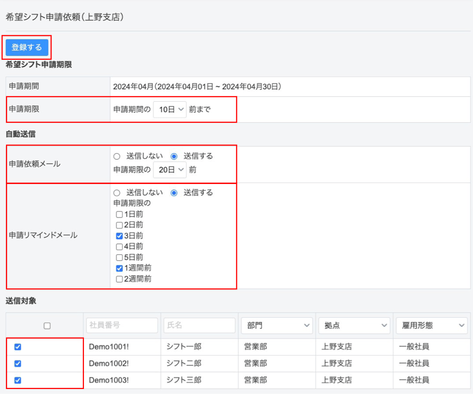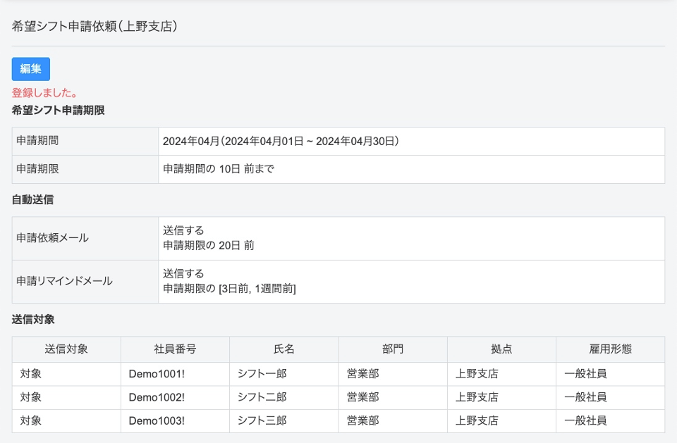 希望シフトの申請依頼メールを送信対象者へ送信。
